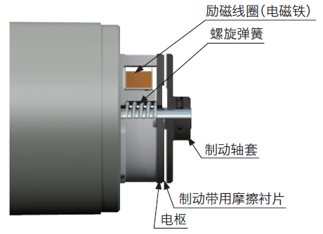 在未施加電壓的狀態下電樞會釋放,制動帶用摩擦襯片受螺旋彈簧擠