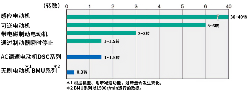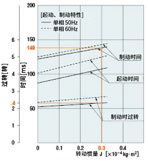 下圖為帶電磁制動的轉動慣量和制動特性(制動時間、過轉)的關系示意。制動時間及過轉是切斷電源的瞬間到電動機停止的時間及過轉。25W的情況下,電動機軸換算的轉動慣量以0.3[×10-4kg?m2]運行時,制動時間為140msec、オー過轉為2.4轉。