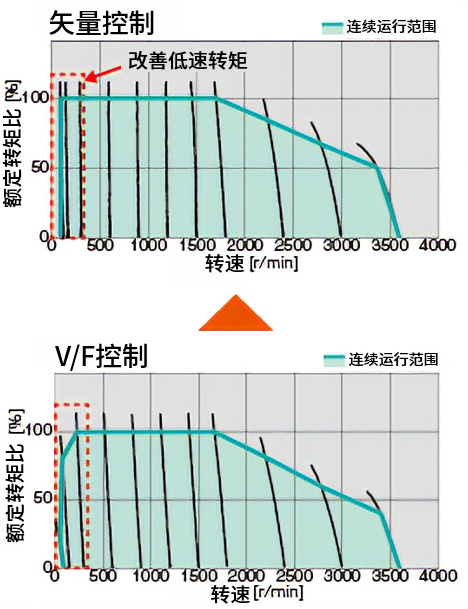 通過矢量控制改善低速~中速領域的轉矩 通過將變頻器的控制方式設為矢量控制,
