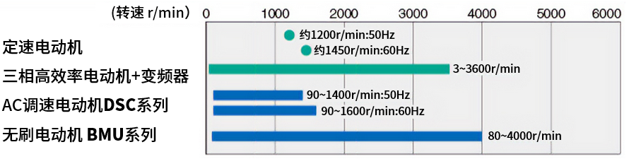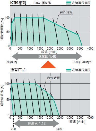 廣泛的速度控制范圍 使用變頻器,可在3∼最大120Hz(90~3600r/min)*的寬廣范圍內進行速度控制。 包括減速機可對應高轉速的使用。*速度控制范圍因品名而異。詳情請洽詢客戶咨詢中心。或距離您最近的銷售點(?點此查看各銷售點聯絡方式) ![]() |