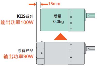 電動機的輸出功率提高 通過高效率化,安裝尺寸90mm可達到100W的輸出功率。并且總長度比原有產品縮短15mm,有助于實現裝置小型化。![]() |