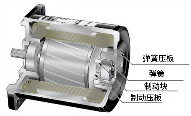 機構中如圖所示,通過彈簧一直對制動塊及制動壓板施加壓力,使其滑動。雖具有一定程度的保持力,但此構造在制動力上有一定的限度,本公 司將之設為電動機輸出轉矩的約10%。