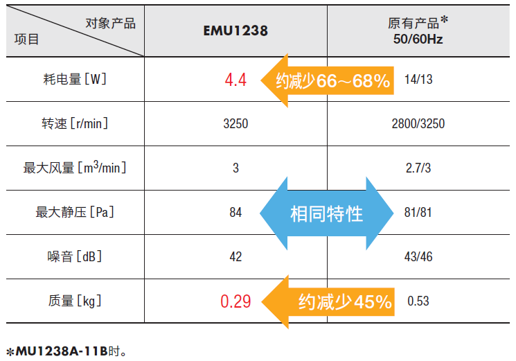 通過使用無刷電動機,耗電量降低了約68%?1 。預期壽命?2 60,000小時(約6年)