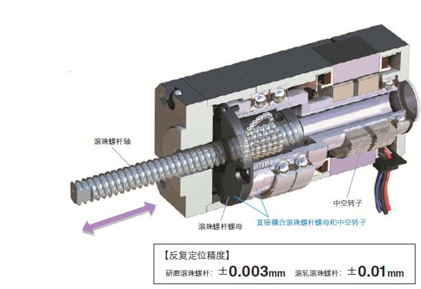 采用了將轉子中空化處理,在其內部收納滾珠螺桿的構造。無需使用客戶自行準備的聯軸器及滾珠螺桿軸承等部件,可實現裝置的小型化和輕量化。