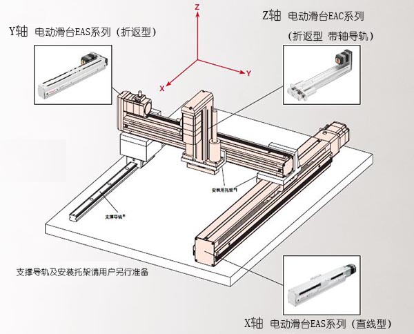 以下是X-Y軸采用了電動滑臺EAS系列,Z軸采用了電動缸EAC系列的3軸的裝置示意圖。