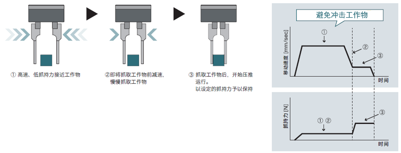 高速接近工作物。即將觸碰前減速,可通過低速壓推。