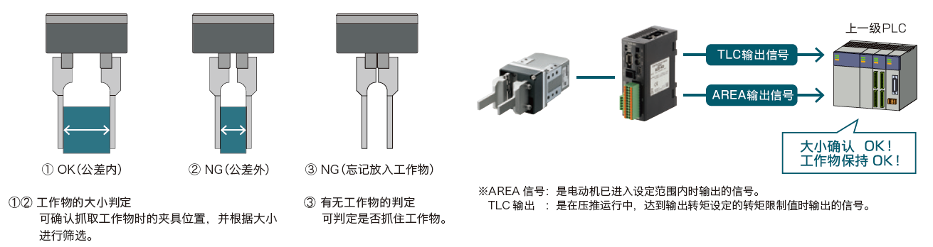 ●在手指的動作范圍內,進行工作物大小及有無工作物的判定可利用來自驅動器的輸出信號(TLC輸出、AREA輸出)確認手指動作范圍,