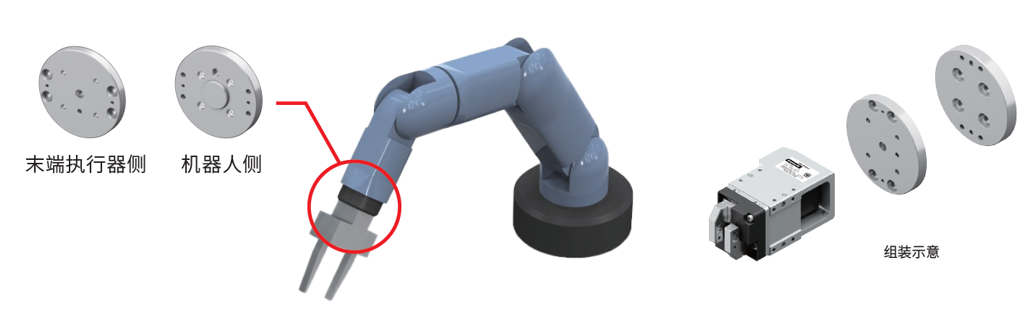 EH系列備有用于在工業機器人上安裝末端執行器設備的法蘭盤。有助于治具的設計及減少制作工時。而且,機器人側的法蘭盤形狀符合ISO9409-1(JIS B 8436)標準。