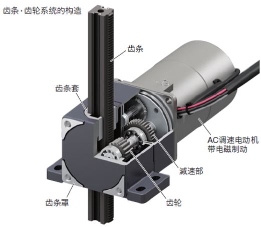 齒條·齒輪系統的動作 齒輪軸電動機由減速機(減速部)承載, 再通過齒輪傳遞到齒條,轉變成直線運動。 |
