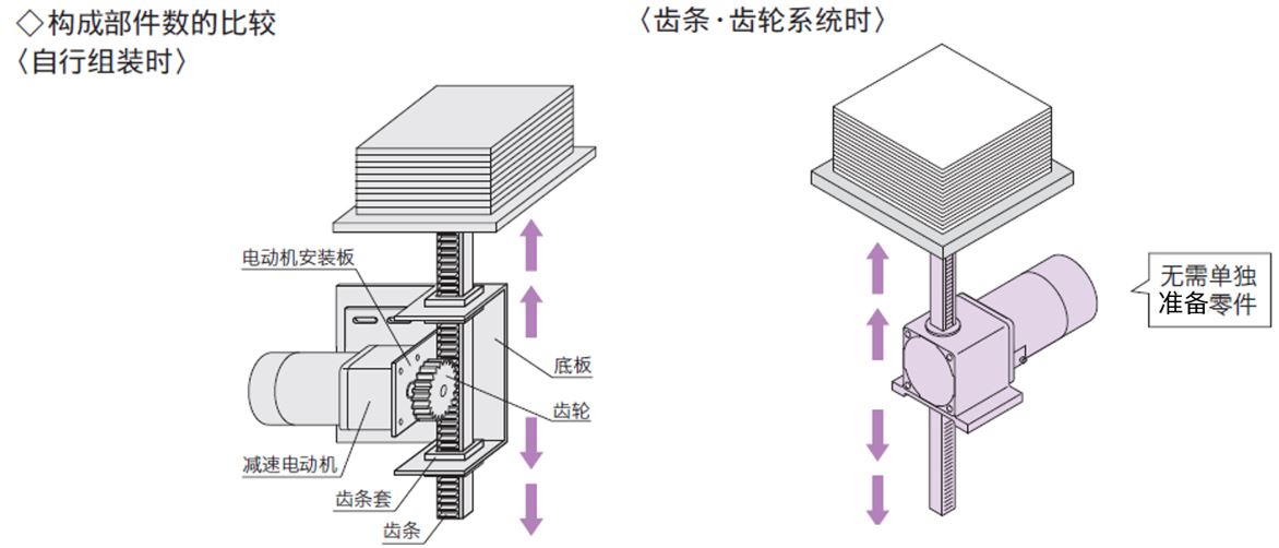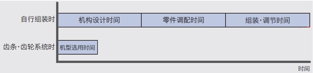 采用本公司的齒條· 齒輪系統,與自制產品相比,可減少使用的零件,也可大幅縮減設計和組裝上所花費的時間。