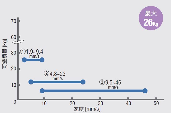 實現上下驅動 通過結構簡單的齒條· 齒輪系統和AC調速電動機的組合,實現了可 搬質量6.6∼67kg。能夠以合理的價格搬運重物。 可根據使用方法來選擇的3個可變速度范圍 搭載能夠在上下運行中進行速度控制的AC調速電動機DSC系列。 每個安裝尺寸可從3個可變速度范圍中選擇。