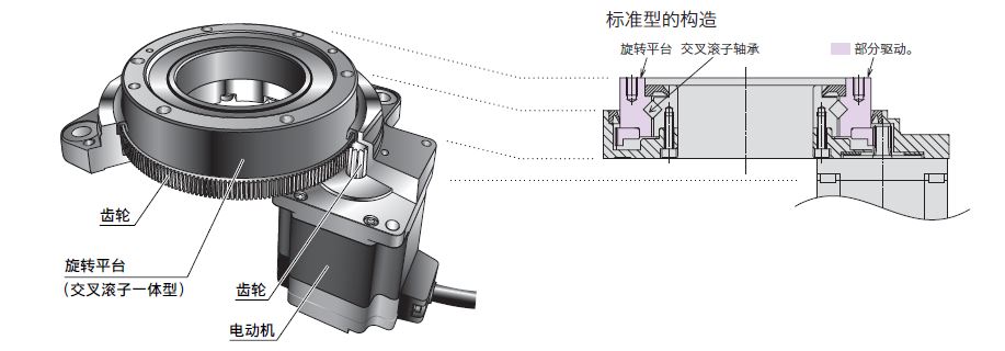 旋轉(zhuǎn)平臺(tái)采用交叉滾子軸承,實(shí)現(xiàn)了高輸出功率與高剛性。