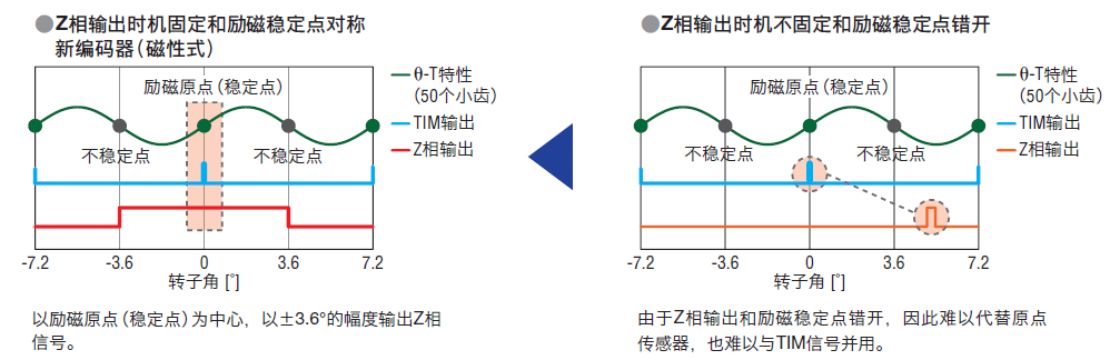 在勵(lì)磁原點(diǎn)(穩(wěn)定點(diǎn))輸出Z相信號(hào),因此可代替原點(diǎn)傳感器(安裝在電動(dòng)機(jī)軸上檢測1圈內(nèi)原點(diǎn)的傳感器)。