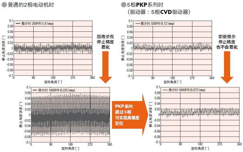 5相步進(jìn)電動(dòng)機(jī)PKP系列的步距角為0.72? (高分辨率型0.36?)、停止精度為±0.05?,因此可實(shí)現(xiàn)高精度定位。此外,通過微步驅(qū)動(dòng)的驅(qū)動(dòng)器控制時(shí)的靜止角度誤差,可實(shí)現(xiàn)與整步驅(qū)動(dòng)時(shí)基本不變的高精度。