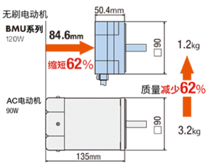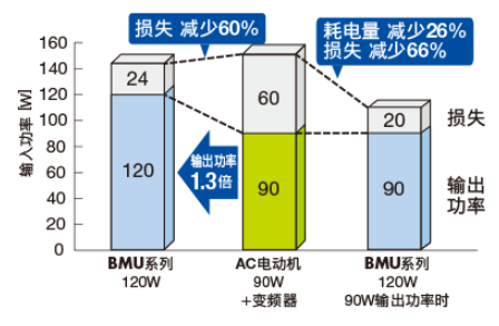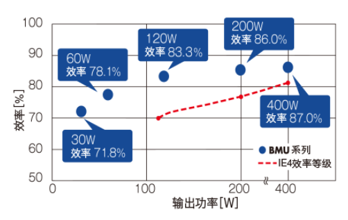 內(nèi)藏永磁磁鋼的無刷電動機比三相電動機(異步電動機)更高效率。例如,BMU系列200W時,電動機、驅(qū)動器的效率為86%,高于IE4基準(zhǔn)值75.8%,具有節(jié)能效果。