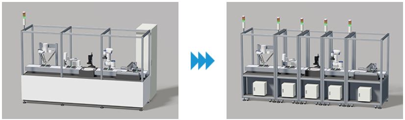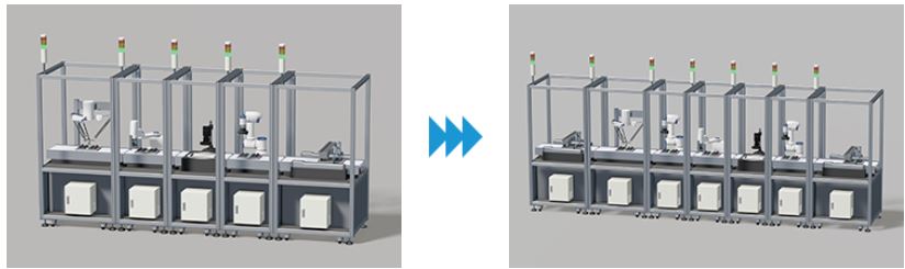 將分隔產(chǎn)線的傳送帶變更為搬送機器人,可實現(xiàn)靈活搬送,從而有助于提升產(chǎn)線生產(chǎn)效率。