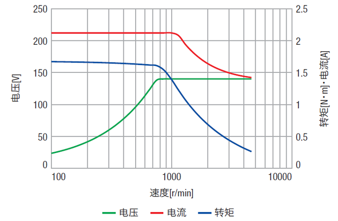 右圖表示恒流驅動器的速度與相電流、相電壓、轉矩之間的關系。 恒流驅動的電壓隨著速度的上升而增加,將電流控制到恒定。 當電壓達到上限,則執行恒壓驅動,此時電流和速度會同時減少。