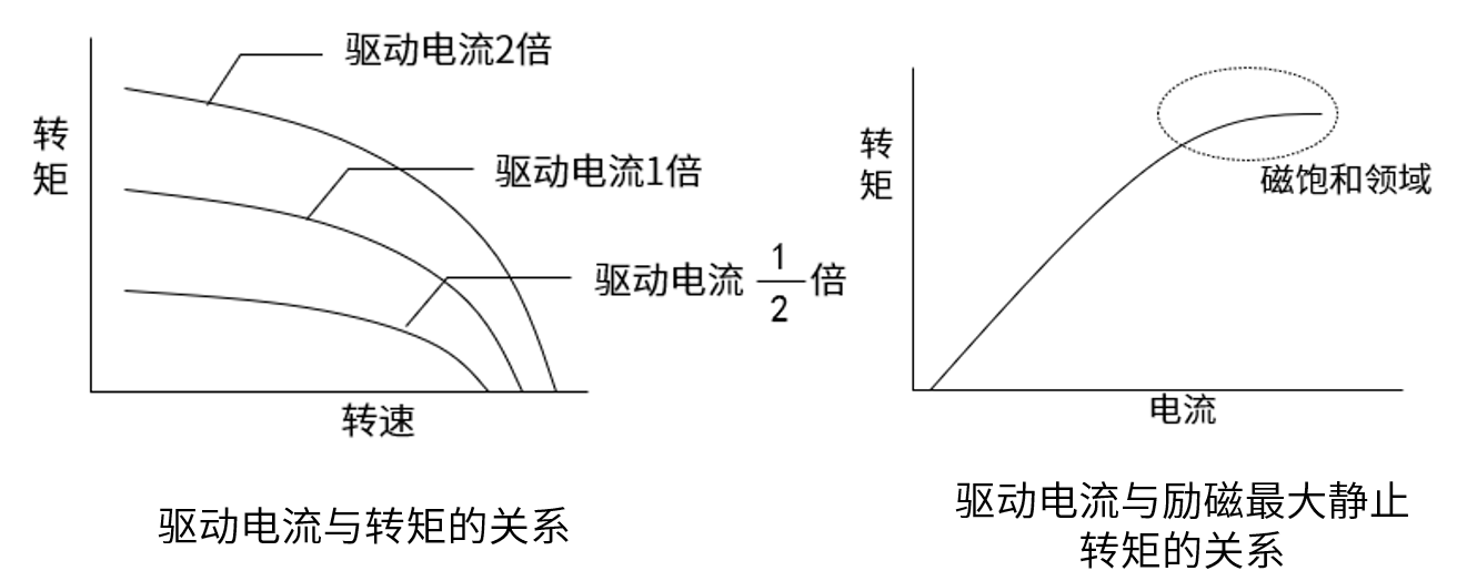 ![]() ①驅動電流增大的同時,電動機發熱也會增大。 施加高電流時,注意不要超過額定電流。 ②電動機轉矩會因驅動電流的逐漸提高, 最終達到磁飽和領域后,轉矩不再提升 |