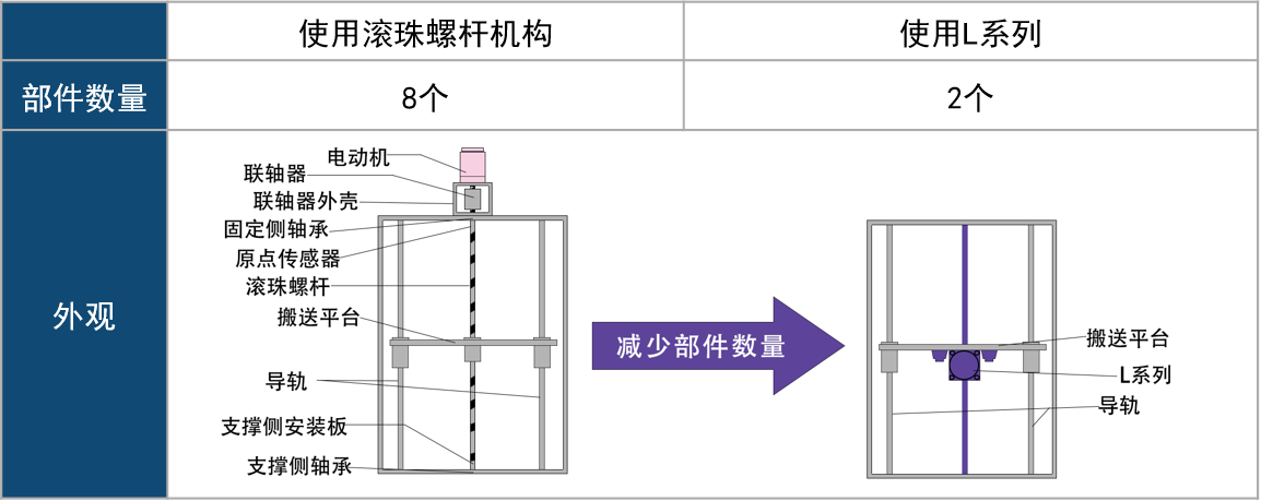 ●增加可搬質(zhì)量的同時(shí),相較于使用滾珠螺桿機(jī)構(gòu)更省空間