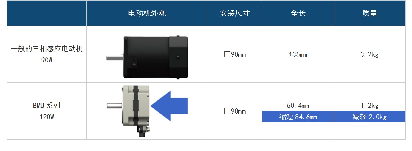 ●實(shí)現(xiàn)設(shè)備小型化·輕量化 將三相感應(yīng)電動(dòng)機(jī)更換為BMU系列,可實(shí)現(xiàn)設(shè)備整體的小型化·輕量化。