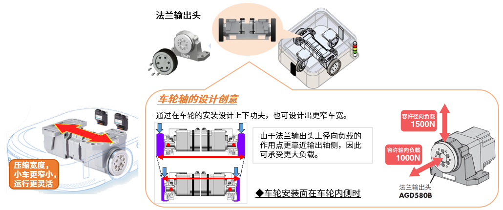 ■妙用中空軸扁平減速機·車寬設計新方案 利用中空軸扁平減速機在同軸上交叉安裝, 有效縮小車寬,助力實現小車的窄小化。 ![]()