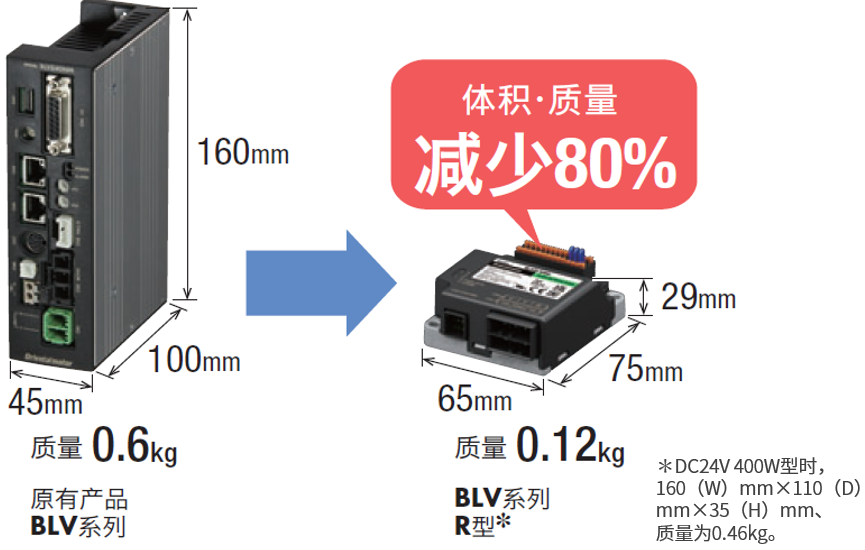 輸出相近轉矩的電動機,全新小型·輕量化的BLV系列R型,安裝尺寸更小、長度更短、質量更輕。有助于: 小車車寬更窄,可利用更狹窄的通道進行機器人移動及多車會車運行,提升空間利用率。 針對空間有限的半導體車間,有效壓縮了設備間的間距空間設計。 |
