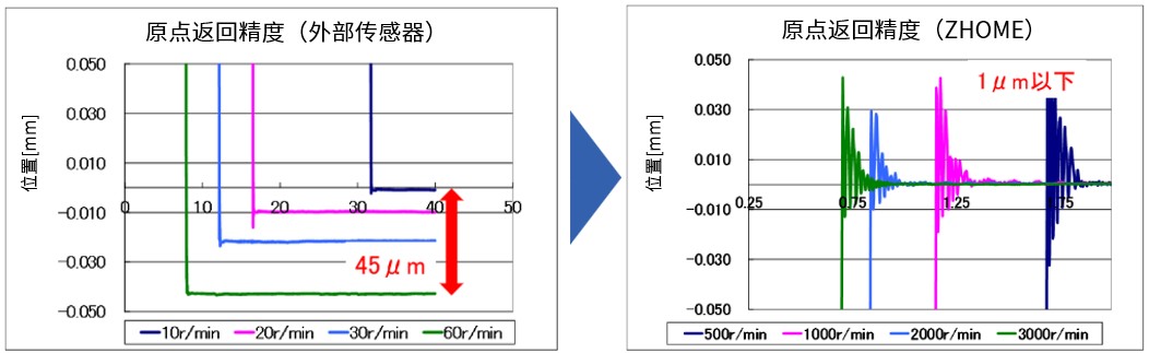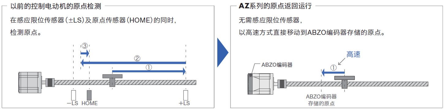 相較于外部傳感器的原點返回,AZ系列的絕對原點返回可避免傳感器感應時的偏差與速度限制,精度更高、回原速度更快。