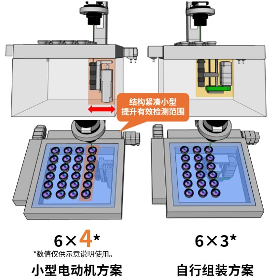 相較自行組裝,檢測光源部件可直接安裝于小型電動缸上。縮小光源結構的占用空間,減少動作時機構干涉的可能,提升平臺有效檢測范圍。