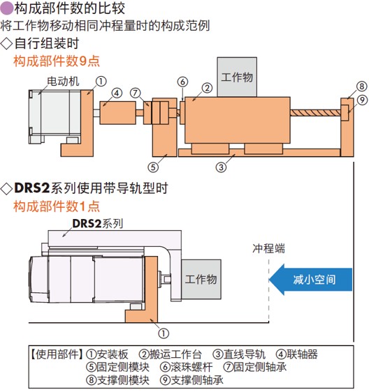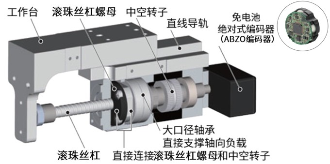 ●無聯軸器等部件,將中空轉子和滾珠絲杠螺母一體化。