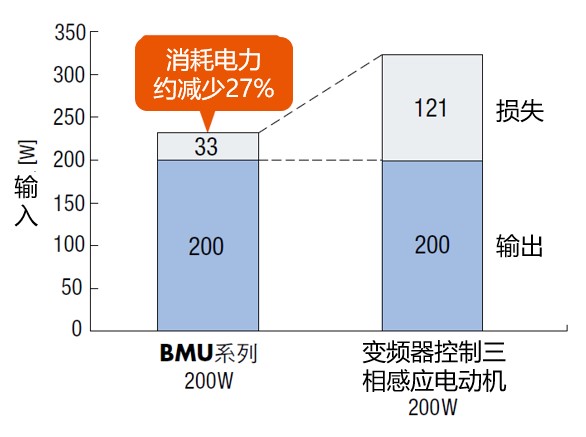 無刷電動(dòng)機(jī)的轉(zhuǎn)子部使用了永磁磁鋼,能夠減少轉(zhuǎn)子的二次損耗。以BMU系列200W產(chǎn)品為例,與相同功率的變頻電動(dòng)機(jī)相比,有效降低了轉(zhuǎn)化為熱能的損耗,