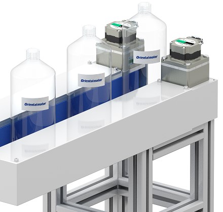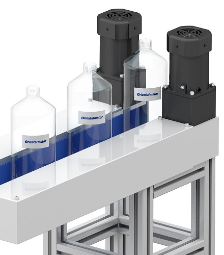 如上圖所示,通過2臺感應電動機驅動雙列傳送帶來搬運筒狀工作物的機構。常用于飲料瓶搬運和貼標等。