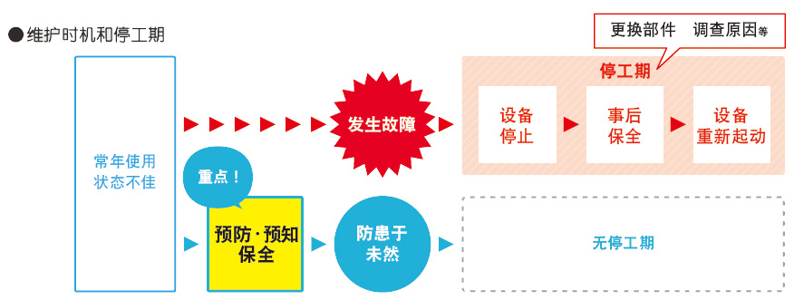 一直以來,在發生故障后停止生產線進行維修的“事后保全”是主流的思維方式。如果只是簡單地更換損壞的部件就 能夠復原,損失會較少,但如果不知道原因,裝置無法運行的停工期延長,則會嚴重影響生產進度。