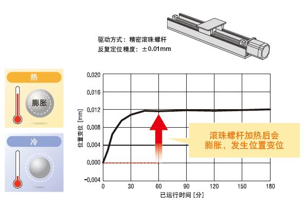 金屬因溫度變化而膨脹、收縮。滾珠螺桿為鐵質,所以加熱后會膨脹。對要求高精度定位時,通過將“電動機的溫度變化”、“已運行時間”、“珠螺桿的位置變位”可視化,可以維持、管理高精度的定位。