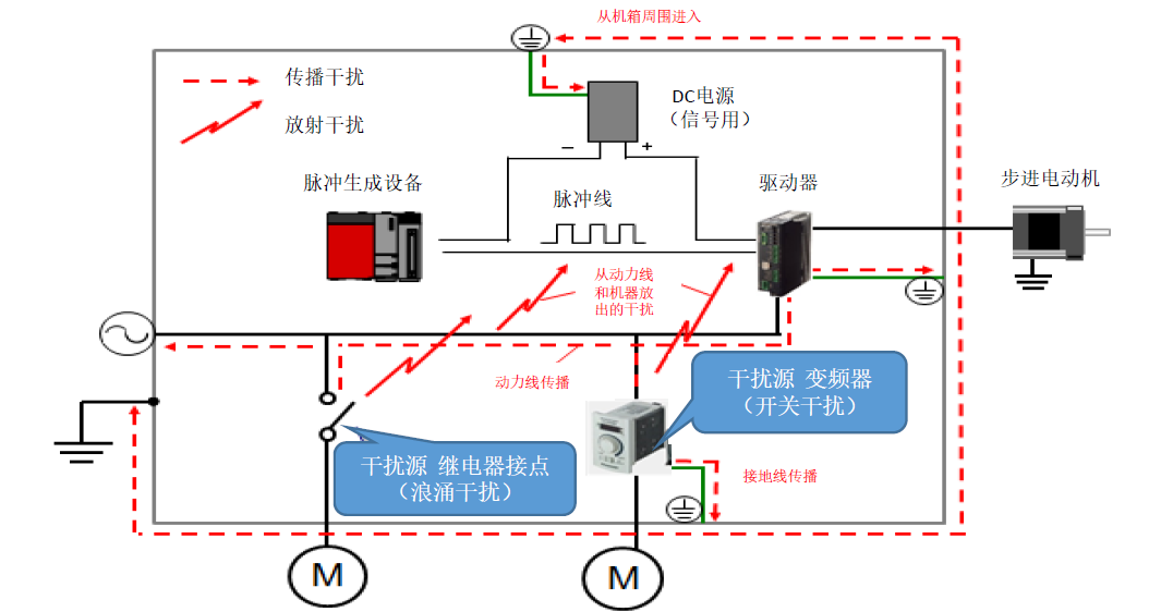 步進電動機的驅動器接收到控制器發出的脈沖信號后,向電動機發送電流,使電動機按照脈沖指令運行。在此過程中,控制器與驅動器之間的脈沖傳輸收到干擾,便會引起電動機的誤動作。![]() 干擾主要源自何處?