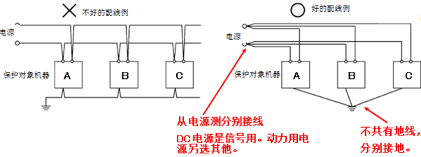 ①抑制發生源的干擾通過加裝零部件(如濾波器、吸收電流電壓用的回路、以及磁環等)解決電壓變化以及電磁干擾帶來的影響。 ![]() ②使用不易傳導干擾的配線 ●通過將動力線和信號線分開 ●縮小配線環 ●將脈沖線變成雙絞線以抵抗干擾。 ●避免共通阻抗 ●分電源 ●屏蔽(多點接地) 如下圖所示,下圖中,ABC三個對象機器在改造后,實現從電源側分別接線,將動力線和信號線分開,并且采取多點分別接地的方式,以此有效減輕了干擾。 ![]() ③提高接受方的承受量 脈沖信號采取差動輸出的方式。可通過使用開路集電極轉差動輸出模塊VCS06,通過差動輸出的方式,減輕干擾。 ![]()
