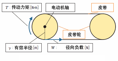 以皮帶機構為例,如下圖,驅使皮帶運行的是傳動力矩T[N·m]。皮帶輪的半徑為有效半徑γ[m],