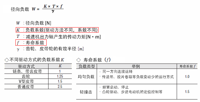 當然,實際徑向負載的計算,更為復雜。根據負載種類和驅動方法,徑向負載的計算也會有所不同。例如,如果是平皮帶機構,徑向負載數值會變大。關于壽命系數,電動機頻繁運行停止或者改變旋轉方向時,數值也會變大。
