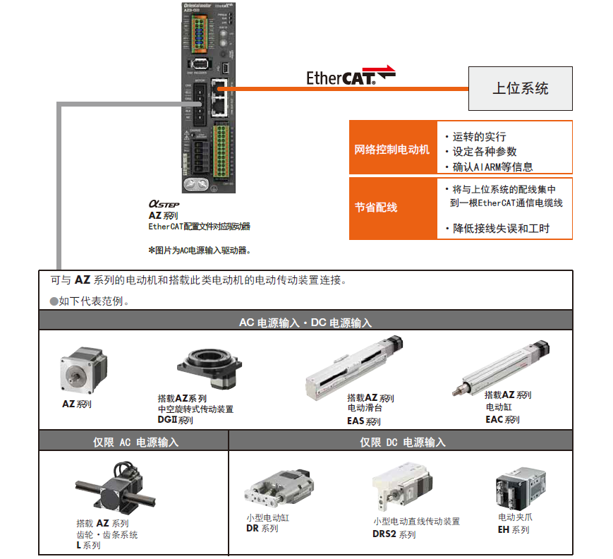 另外,AZ系列步進(jìn)電動(dòng)機(jī)可采取EtherCAT通訊,可實(shí)現(xiàn)網(wǎng)絡(luò)直接控制,相較于RS-485通訊方式,在節(jié)省配件的同時(shí),可實(shí)現(xiàn)更多復(fù)雜的動(dòng)作,應(yīng)對(duì)不同需求。 (?點(diǎn)此查看αSTEPAZ系列詳細(xì)介紹)