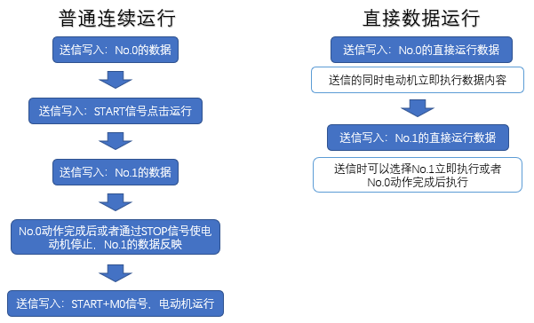 ●直接數(shù)據(jù)運(yùn)行功能 一般普通連續(xù)運(yùn)行,連續(xù)寫入多段數(shù)據(jù)時(shí),要反映多段數(shù)據(jù),需要等前一段動(dòng)作完成后或者通過STOP信號,讓電動(dòng)機(jī)停止,才能得以實(shí)現(xiàn),類似于I/O控制運(yùn)行。 ![]() 而直接數(shù)據(jù)運(yùn)行功能,可以直接寫入執(zhí)行數(shù)據(jù)內(nèi)容,進(jìn)行多段數(shù)據(jù)運(yùn)行時(shí),也可以選擇直接執(zhí)行或者前一段動(dòng)作完成后執(zhí)行,無需停止命令,有效節(jié)省時(shí)間,類似于脈沖控制運(yùn)行。