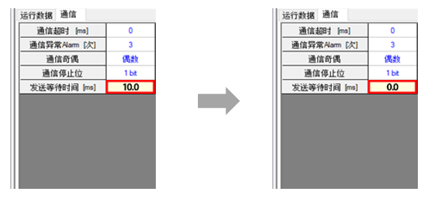 (?點(diǎn)此下載支援軟件MEXE02)通訊周期中發(fā)送等待時(shí)間Tb2可以通過軟件設(shè)定來縮短。以東方馬達(dá)的支援軟件MEXE02為例,發(fā)Tb2發(fā)送等待時(shí)間的出場設(shè)定是10ms可通過設(shè)定,將其設(shè)定為0ms,從而縮短時(shí)長。 ![]() 除此之外,還可以通過減少指令數(shù)量,來實(shí)現(xiàn)整個(gè)通訊時(shí)長的縮短。