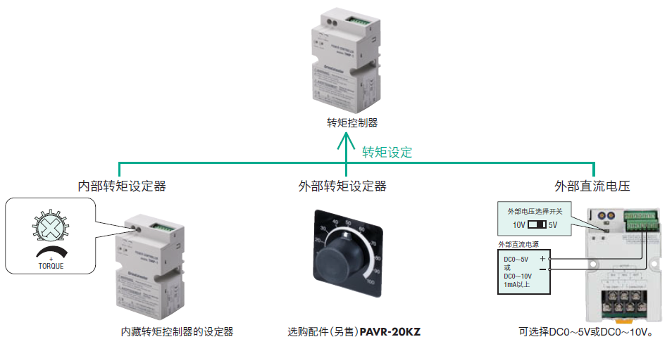 可以通過內(nèi)部轉(zhuǎn)矩設(shè)定器、外部轉(zhuǎn)矩設(shè)定器、直流電壓控制等三種控制設(shè)定方法,靈活便利,可針對不同情況選擇合適的控制設(shè)定方法。且無需額外配備張力控制器或轉(zhuǎn)矩檢測器,造價更低。