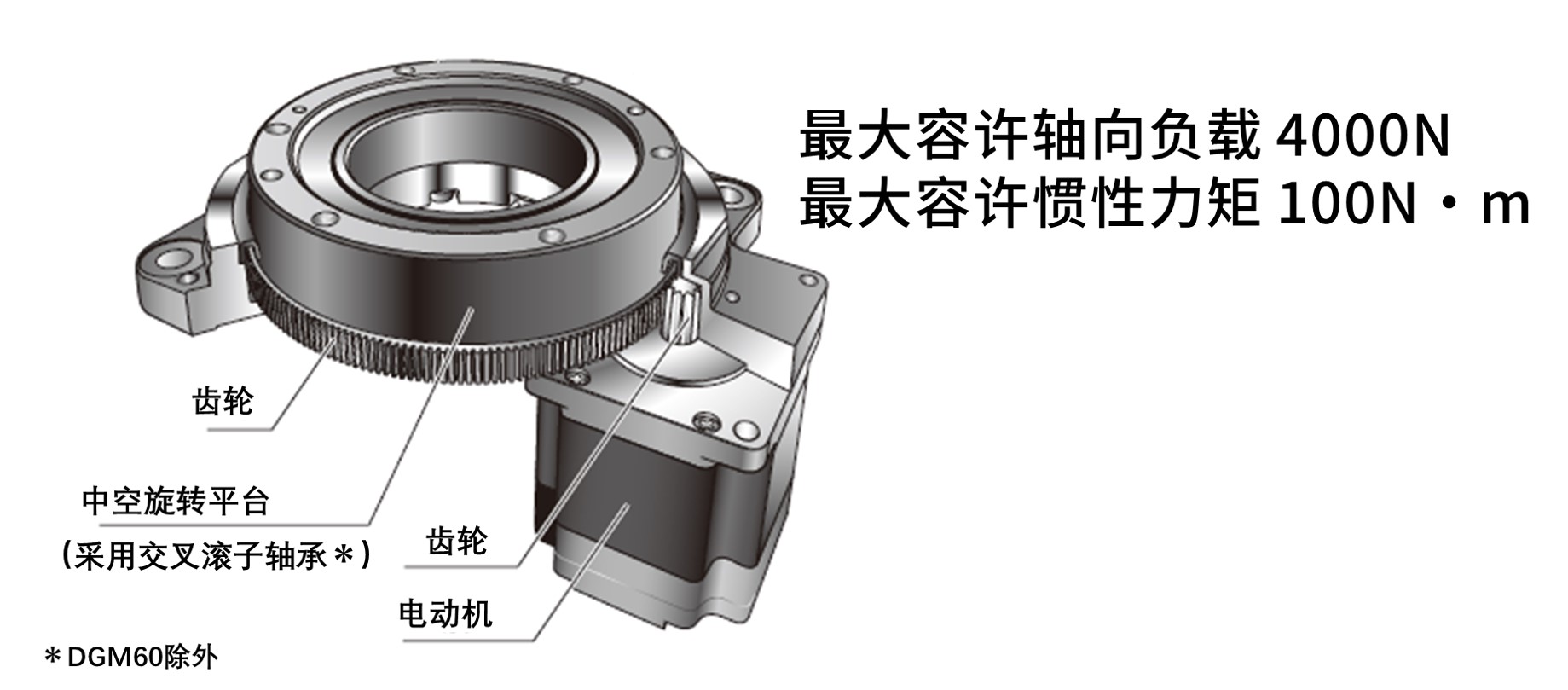 DGⅡ系列是中空旋轉式工作臺與混合控制系統αSTEP所組成的一體化產品。傳動裝置內部為減速機結構,可實現高轉矩驅動。中空旋轉平臺的軸承采用交叉滾子軸承,實現了高負載與高剛性。