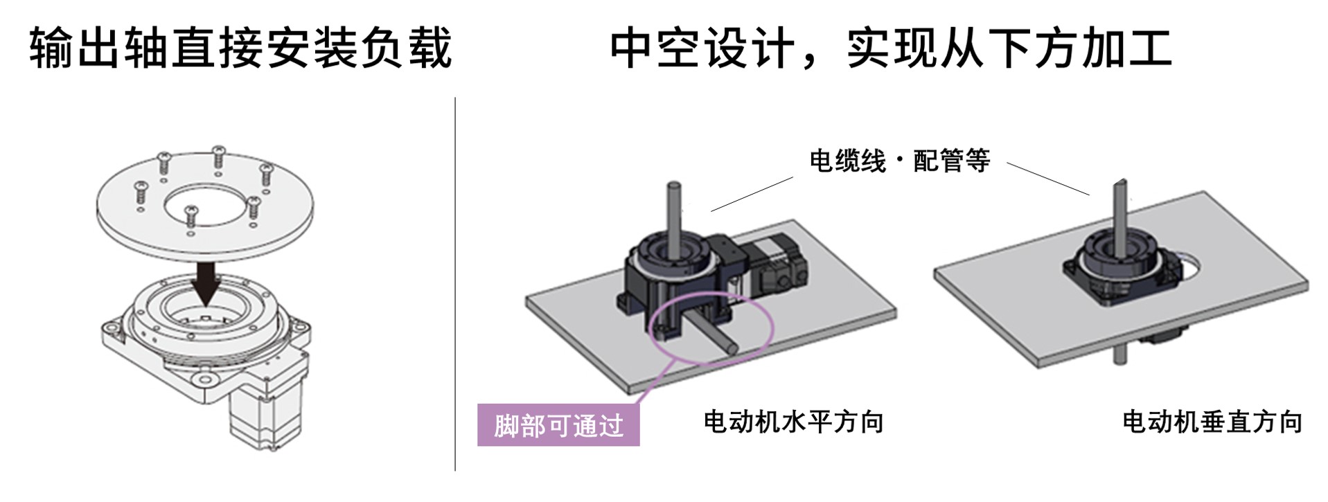 可直接將負載安裝在中空的平臺之上,不僅省去傳動機構,方便安裝,更能通過中空設計實現由下而上的配線?配管。