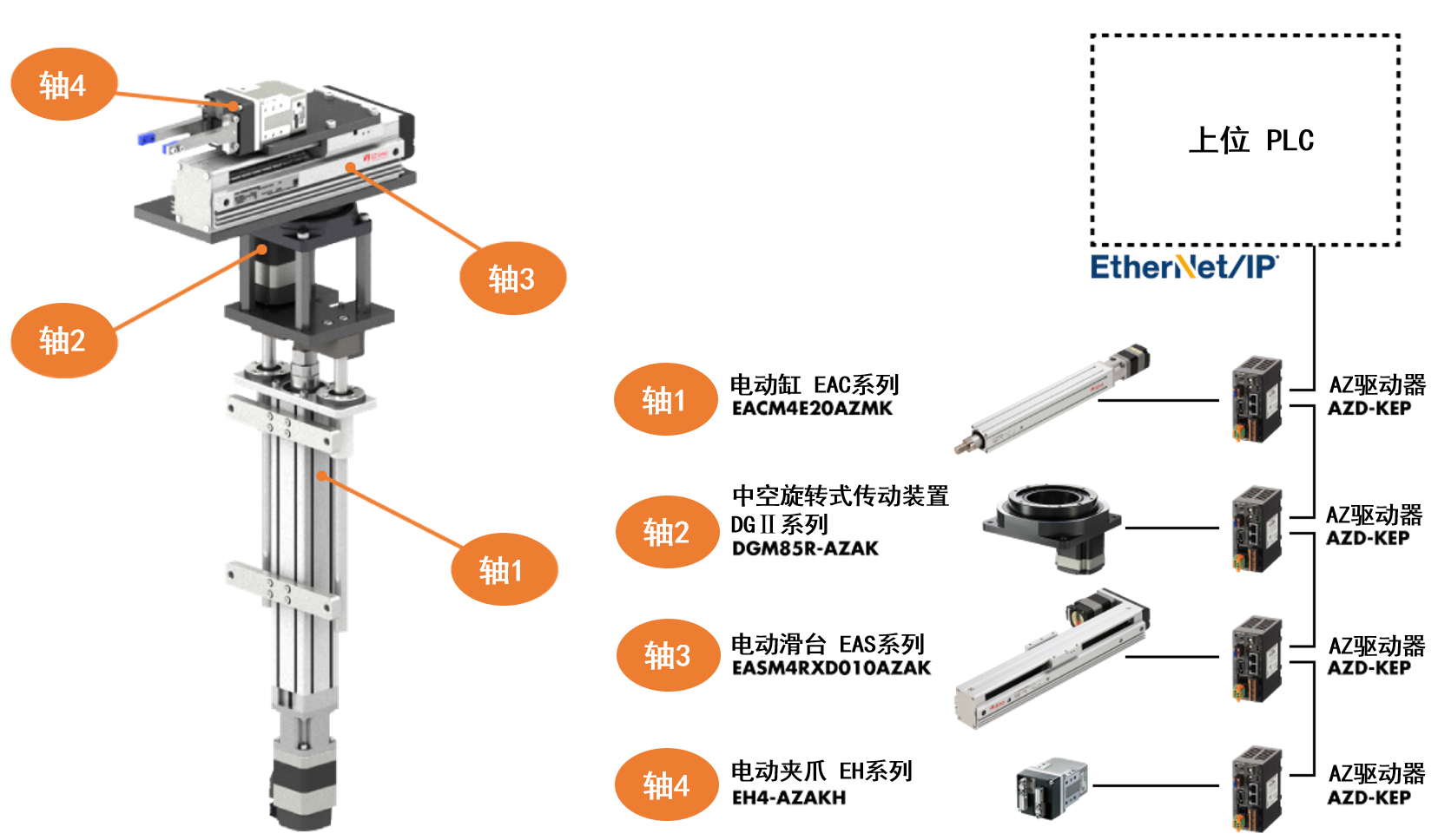 采用配有鋁制活塞桿的小型·輕量的高推力電動缸。 此裝置可對總重量7.7kg的旋轉(zhuǎn)·水平移動·抓持工作物的機(jī)構(gòu)部進(jìn)行升降。