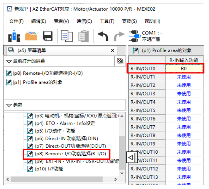 1、打開MEXE02軟件(?點此進入MEXE02下載頁面),點擊參數中的「Remote-I/O功能選擇」,將R-IN/OUT0的「R-IN輸入功能」參數設定為「R0」。 ![]()