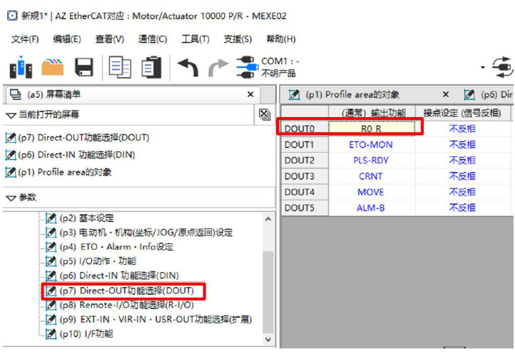 2、點擊參數中的「Direct-OUT功能選擇」,將DOUT0的「(通常)輸出功能」參數設定為「R0_R」。
