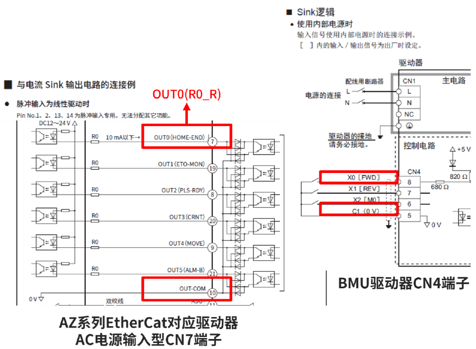 將AZ驅動器的7號信號點(R0_R)連接到BMU驅動器的8號信號點(FWD),將AZ的10號COM口連接到BMU驅動器的5號C1口從而形成回路。![]() 三、設定AZ系列「R0」設為ON,輸入信號控制BMU系列旋轉