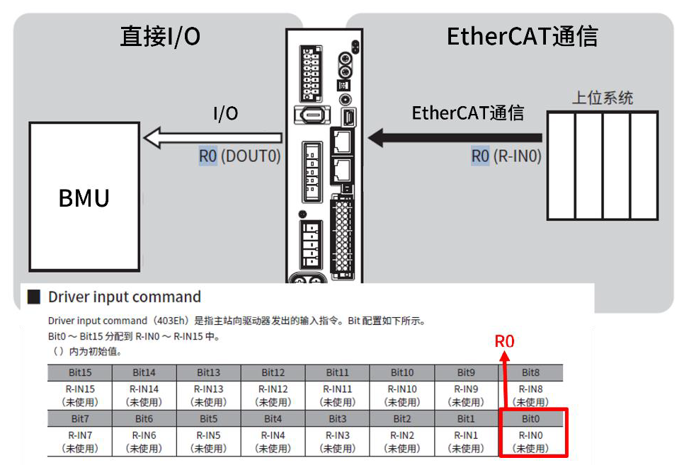 接通電源后,通過上位給AZ驅動器發送R0信號(通過SDO映射給403Eh發送0001代碼-EtherCAT通訊時)后,驅動器會通過直接I/O自動給BMU發送反饋信號R0_R信號從而觸發BMU的FWD信號實現電機的運轉。![]() 相關產品
