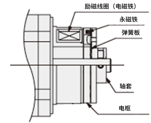 當制動控制的開關為OFF時,勵磁線圈停止通電,制動片脫離勵磁線圈吸引電動機軸被固定,使得出現停電等突發事件時也能保持負載防止落下。通電后勵磁線圈則吸引并釋放制動片解除制動。