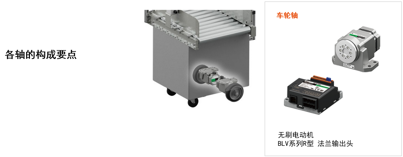 AGV由2軸的電動機、2輪的車輪實現運行,由1軸傳送帶完成向下一個工序的搬送。通過此裝置,將手動的搬送工序變為自動化,有助于削減固定的傳送帶、節省人力。<高輸出功率?小型> 無刷電動機 BLV系列R型